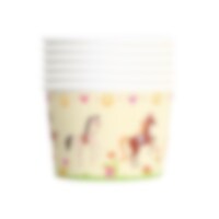 Server is eller andre lækkerier i disse fine bægre med sødt hestedesign. Med farverige heste, hjerter, blomster og hestesko bringer de tankerne hen på en solrig dag på landet – perfekte til børnefødselsdage med staldtema. Bægrene rummer 150 ml og er 5,4 cm høje, lavet af pap og både søde og praktiske.