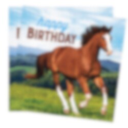 16 stk. servietter med et fint hestemotiv samt teksten "Happy Birthday" i blå og brune farver. Servietterne er 2-lags og måler ca. 33 x 33 cm, når de er foldet ud.