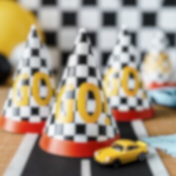 6 stk. festhatte i racerbil-tema med seje motiver af målflaget ved biltævlinger. Festhattene er 16 cm høje og sættes på plads med elastikbånd.