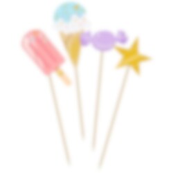6 stk. cake toppers med søde motiver af is, karameller og stjerner. De er smukke at dekorere kager og muffins med. De er lavet af træ og papir og varierer i højde mellem 16-22 cm.
