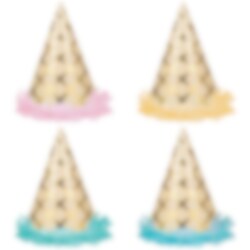 8 stk. festhatte, der forestiller isvafler med frynser i forskellige pastelfarver og guld foliebelagte detaljer. Del disse ud til gæsterne under festen med temaet Ice Cream Party. Hattene er ca. 19 cm høje og sættes på plads ved hjælp af et elastisk bånd.