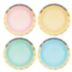 8 stk. paptallerkner i 4 stk. forskellige farver; pastelgrøn, pastelrosa, pastelgul og pastelblå samt med guldbelagte kanter fra det smukke tema Ice Cream Party. Dejligt at sætte på bordet før enhver fest, 18 cm i diameter.