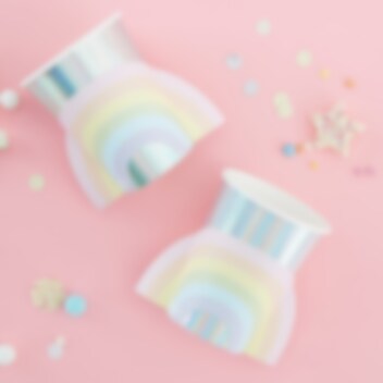 8 stk. eksklusive papkrus i glitrende perlemorssølv og med pastelfarvede regnbuer. Et imponerende tilbehør til din fest. Krusene er ca. 10 cm høje og kan rumme ca. 270 ml.