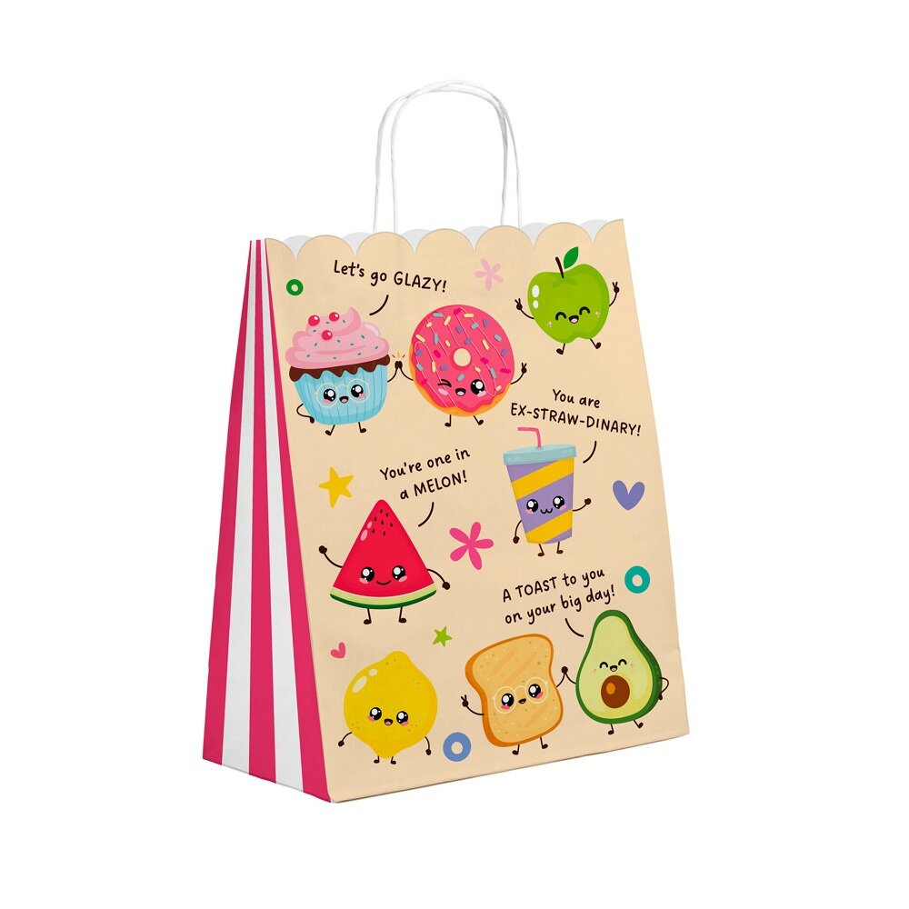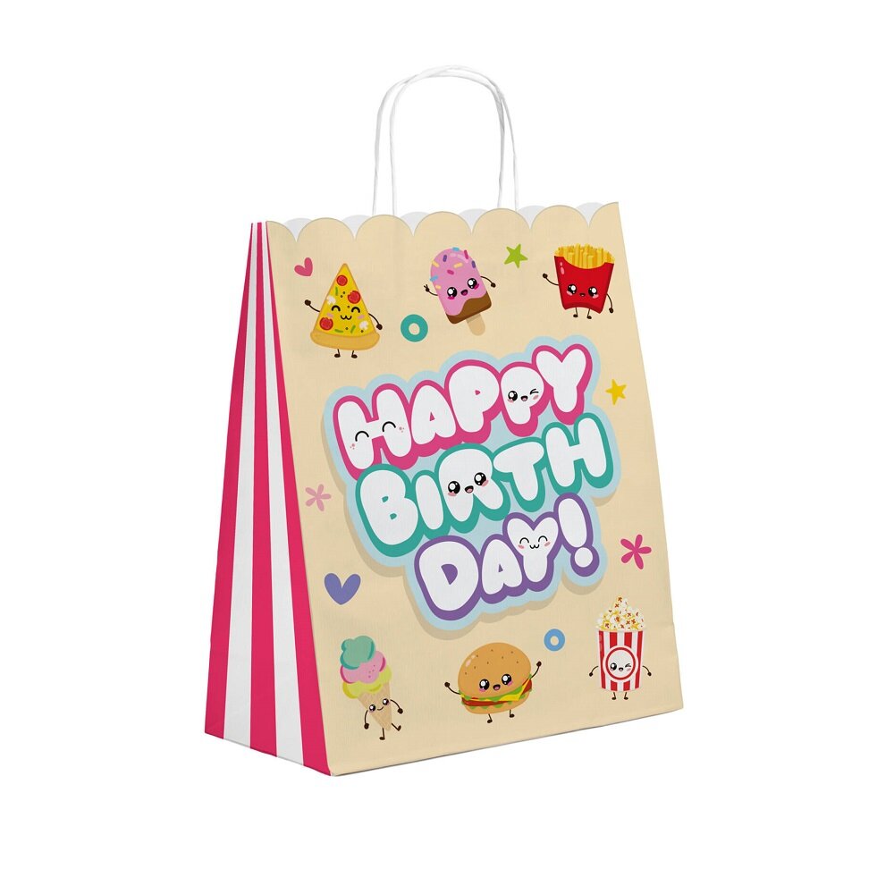 6 slikposer med Kawaii-tema, en farverig og legesyg detalje til børnefødselsdagen. Poserne er prydet med søde illustrationer af frugter, snacks og lækkerier sammen med teksten Happy Birthday, hvilket gør dem perfekte til en fødselsdag med Kawaii-tema.