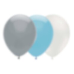15 stk. latexballoner i farvekombinationen grå, lyseblå og hvid med fem balloner i hver farve.