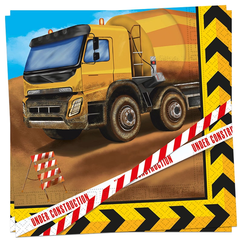 20 stk. servietter med motiv af en gul betonblander på en byggeplads. Servietterne har 2 lag og er 33 x 33 cm udfoldede. Lavet af FSC-certificeret papir.