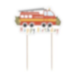 Cake Topper med motiv af en brandbil og teksten "Happy Birthday" i muntre farver. Højde 19 cm.