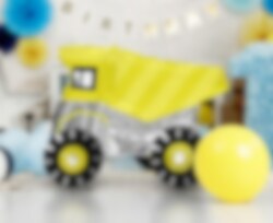 Seje folieballon der forestiller en gul dumper. Med en størrelse på 63 x 35 x 44 cm vil denne ballon blive et øjeblikkeligt hit på din børnefødselsdag.
