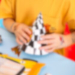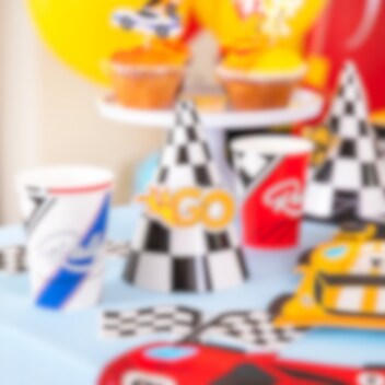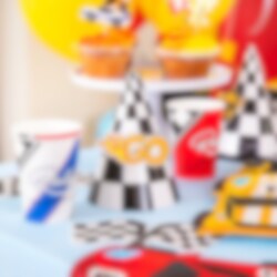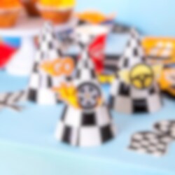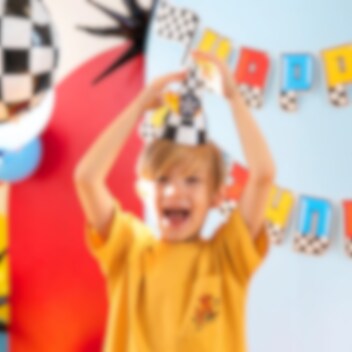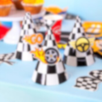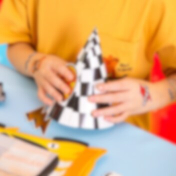 6 stk. festhatte i klassisk ternet racing-mønster, perfekte at have på, når den lille racerkører fylder år! Hattene samles nemt og dekoreres med medfølgende trykte papirdekorationer med racing-tema, som fæstes med glue dots.