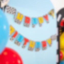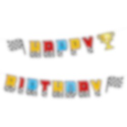 Dekorer fødselsdagen med denne farverige Happy Birthday-guirlande i Racing Car-tema! Bogstaverne kommer i gult, rødt og blåt med en ternet ramme og afsluttes med en guldtrofæ i midten og flag i enderne, et perfekt blikfang for den lille racingfan.