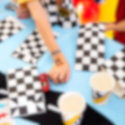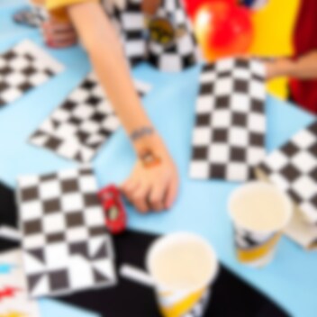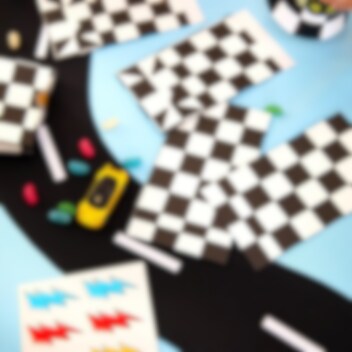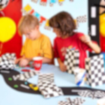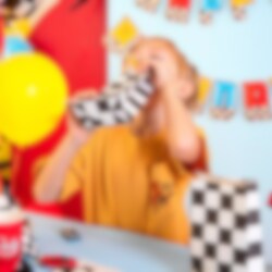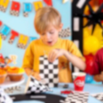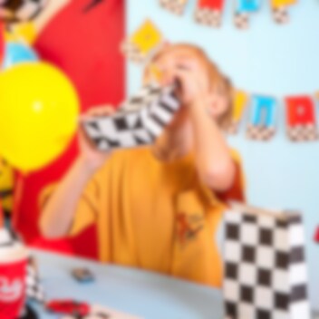 6 stk. flotte slikposer i klassisk ternet racing-mønster, perfekte til at fylde med slik og give til festgæsterne som en sjov lille erindring om den fartfyldte dag! Poserne kommer i tre varianter med lynformede klistermærker i orange, rødt og blåt.