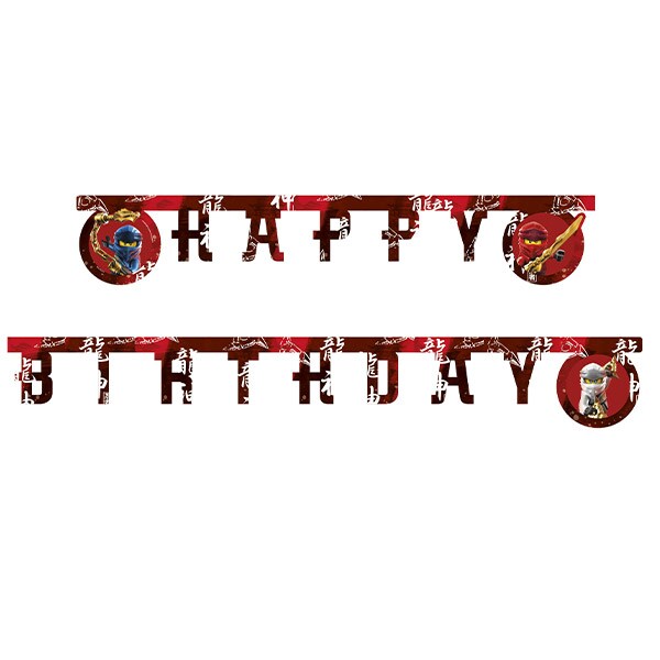 Rød guirlande med teksten "Happy Birthday" og motiver fra den populære LEGO Ninjago. Et rigtig godt tilbehør til festen med LEGO Ninjago som tema. Guirlanden er ca. 2 meter lang og er lavet af FSC-mærket papir.