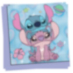 20 servietter med kærligt motiv af Stitch & Angel mod en lilla-blå stjernehimmel, perfekte når du vil skabe en ensartet og drømmende dækning til fødselsdagen med Stitch & Angel-tema.