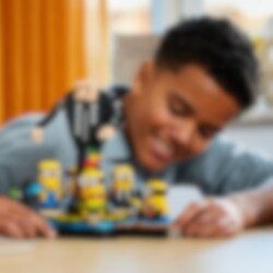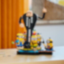 Byg din egen Gru og dansende Minions! Arranger eks-superskurkens arme, hænder og fingre i seje positurer. Nyd Jerry med sine maracas og sin frugthat, hemmelige agent Dave med en hovedpropel og walkie-talkie, sirene-minion med en megafon, den ukulele-spillende Mel og Kevin med sin prutpistol. Drej den siddende minion for at se de andre minions danse rundt om deres smilende chef!