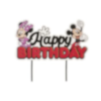 Cake Topper af pap med teksten "Happy Birthday" og charmerende motiver af Mickey og Minnie Mouse. Højde ca. 14,5 cm.