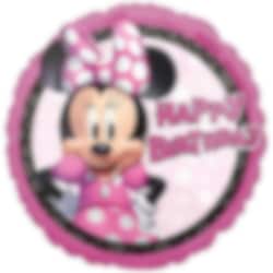 Sort og lyserød folieballon med sødt Minnie Mouse-motiv og teksten "Happy Birthday". En rigtig fin dekoration at have med til festen med Minnie Mouse som tema. Ballonen er ca. 43cm i diameter oppustet og er lettest at puste op med helium.