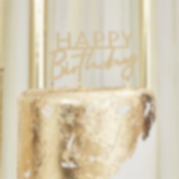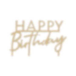 Kagedekoration i guldfarve med ordene "Happy Birthday", 10 cm høj.