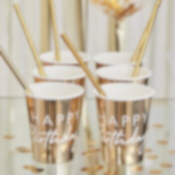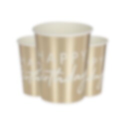 8 stk. guld foliebelagte papkopper med teksten "Happy Birthday" i hvid farve. Dejlig at dekorere bordet med før festen. Krusene er ca. 10 cm høje og holder ca. 250 ml.