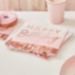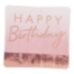 16 stk. servietter i lyserød ombré og med rosaguld foliebelagte frynser og teksten "Happy Birthday" fra Mix it Up-kollektionen. Et passende tilbehør at have med på festbordet. Servietterne er 2-lags og er ca. 33 x 33 cm store udfoldede.