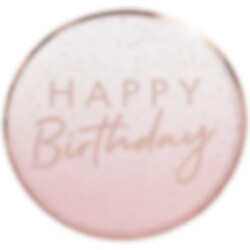 8 stk. paptallerkner fra Mix it Up-kollektionen i en lyserød/hvid ombré med rosaguld foliebelagte kanter, prikker og teksten "Happy Birthday". En perfekt borddekoration til enhver fest med et rosaguld som tema. Tallerknerne er ca. 24 cm i diameter.