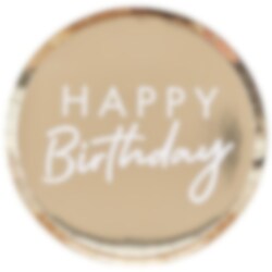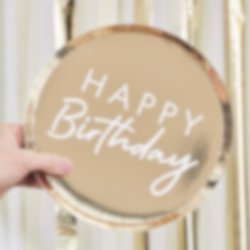 8 stk. guld foliebelagte paptallerkner fra Mix it Up-kollektionen med den hvide tekst "Happy Birthday". Dejligt at sætte på bordet før festen. Tallerknerne er ca. 24 cm i diameter.