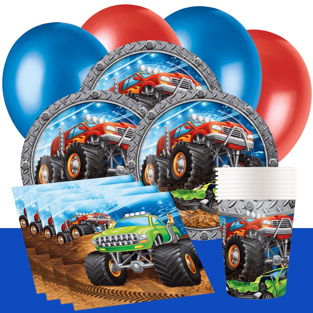 Denne komplette Monster Truck festpakke tilbyder alt, hvad du behøver for en uforglemmelig fødselsdagsfest. Pakken indeholder tallerkener (23 cm), papkrus (266 ml) og servietter (33 x 33 cm) til 8, 16 eller 24 personer.