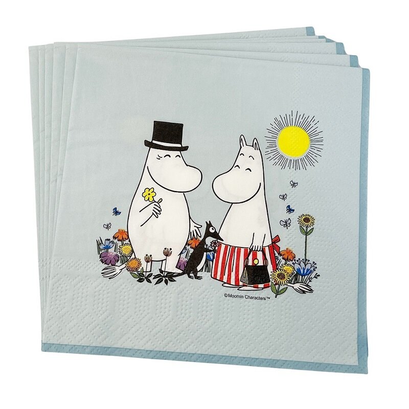 16 stk. charmerende servietter i blå farvenuancer med motiv fra Mumitroldene, som tager gæsterne med på et magiskt eventyr i Mumidalen. Servietterne har 3 lag og er 33 x 33 cm store, når de er foldet ud. Fremstillet af FSC-mærket papir.