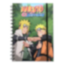 Notesbogen i A5-format har et omslag med Naruto og Minato i stærke farver, spiralryg og linjerede sider. Lukkes pænt med en elastik, klar til enhver mission!