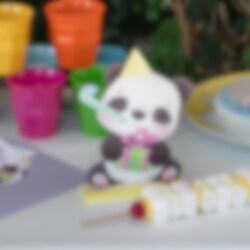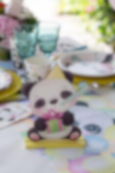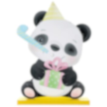 Supersød bordsdekoration med motiv af en panda der er på fødselsdagsfest. Dekorationen er lavet af træ og er 14 x 20 cm.