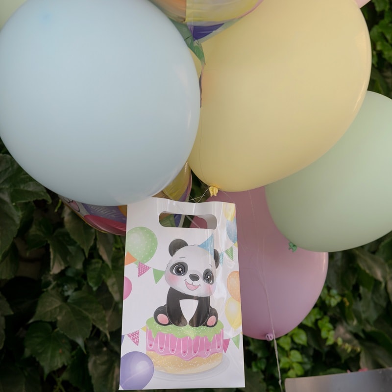 10 stk. slikposer i glansfuldt lidt tykkere papir med motiv af en sød panda, der er til fest. En festlig gave at dele ud til dine venner til festen, fyldt med deres yndlingsslik og småt legetøj.