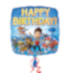 Firkantet folieballon i glade farver med teksten "Happy Birthday" og motiver af hundene og deres leder Ryder fra tv-serien Paw Patrol. Sød som pynt på fødselsdagen. Fylls med luft eller helium. Ca 43 x 43 cm stor.