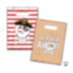 Gør fødselsdagen endnu sjovere med disse fine slikposer i pirattema, perfekte til at fylde med slik, småt legetøj og andre overraskelser til gæsterne. Poserne har to forskellige motiver: det ene med teksten "Hip Hip Ahoy!" på en baggrund, der ligner et gammelt skattekort, og det andet med et dødningehoved, pirathat og røde striber, som forstærker følelsen af et ægte pirateventyr.