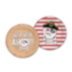 Dæk op til en skøn piratfødselsdag med disse festlige tallerkener i klassisk pirattema. Tallerkenerne har to forskellige motiver: et med teksten "Hip Hip Ahoy!" på en baggrund, der ligner et gammelt skattekort, og et med dødningehoved, pirathat og røde striber, hvilket giver borddækningen en legende og eventyrlig følelse.