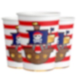8 papirkopper med røde og hvide striber og med et motiv af et smukt piratskib med gulddetaljer. Flot til at tilføje til borddækningen ved en piratfest. Krusene er ca. 9 cm høje og rummer ca. 250 ml.