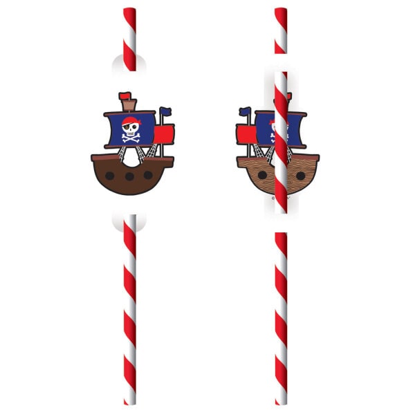 8 rød- og hvidstribede sugerør af pap med pirat-motiver. En sjov lille detalje at tilføje til borddækningen til en fest med pirattema. Måler ca. 19 cm.