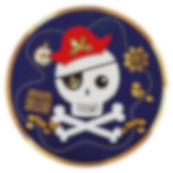8 sjove paptallerkener med et motiv af en Jolly Roger omgivet af pirat-relaterede genstande i guldfarve. Sæt disse tallerkener frem til de små pirater, når det er tid til en piratfest. Pladerne er ca. 22 cm i diameter og er lavet af papir.