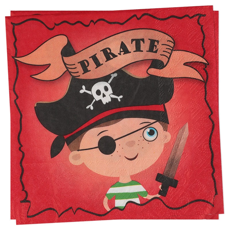 20 røde servietter med en sød lille pirat og teksten "pirat". Match med mere af vores tilbehør til bordservice i temaet små pirater. Servietterne er ca. 16,5 x 16,5 cm udfoldet.