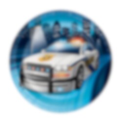 8 stk. desserttallerkener med motiv af en politibil. Tallerkenerne er ca. 18 cm i diameter.
