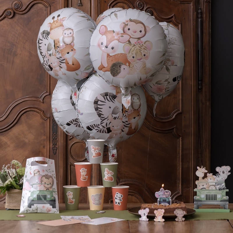 Rund folieballon med motiver af søde små safaridyr. En sjov dekoration til fødselsdagen.