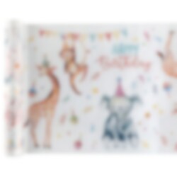 Super sød bordløber i hvid og med et motiv af søde safaridyr, der er klar til en sjov fest. Passer fint sammen med vores andet tilbehør i samme safaritema. Bordløberen er lavet af polyester og er ca. 30 cm bred og 5 meter lang.