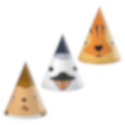 6 stk. festhatte af pap i tre forskellige varianter med forskellige søde motiver af dyreansigter. Hattene er ca 19 cm høje og holdes på plads med en elastikbånd.