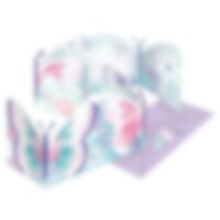 Denne komplette festpakke med med sødt tilbehør i sommerfugletema inkluderer tallerkner (23 cm), papkrus (250 ml) og servietter (33 x 33 cm) til 8 eller 16 personer og 10 stk. lyserøde og 10 stk. lyselilla balloner og en lyseblå plastdug (137 x 274 cm).