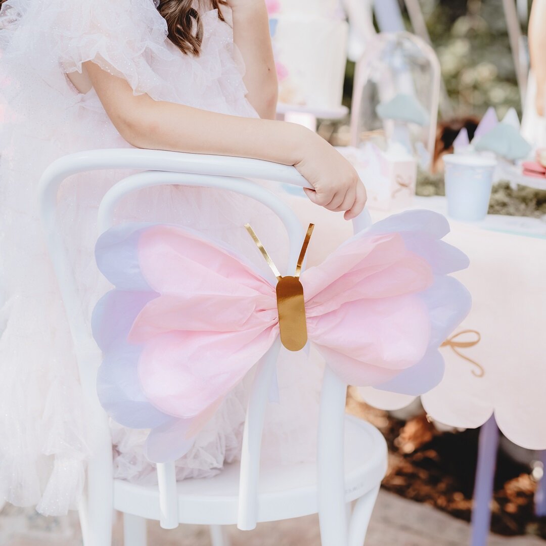 3 stk. smukke sommerfugledekorationer af silkepapir til at dekorere med til børnefødselsdagen. Dekorationerne er mellem 40 og 50 cm store.
