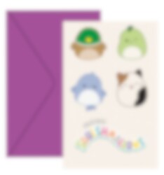 Inviter til en farverig og hyggelig fødselsdag med disse Squishmallows-invitationer med charmerende illustrationer af flere populære Squishmallows-figurer. Perfekte til børn, der elsker de bløde og søde karaktererne. I pakken indgår også seks lilla kuverter.