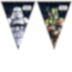 Smart flagguirlande af papir med seje Stormtrooper- og Boba Fett-motiver fra Star Wars. En fantastisk dekoration til at pynte dit værelse til en sjov Star Wars-fest med Star Wars-tema. Guirlanden er ca. 2,3 meter lang, og hver vimpel er ca. 24,5 cm høj.