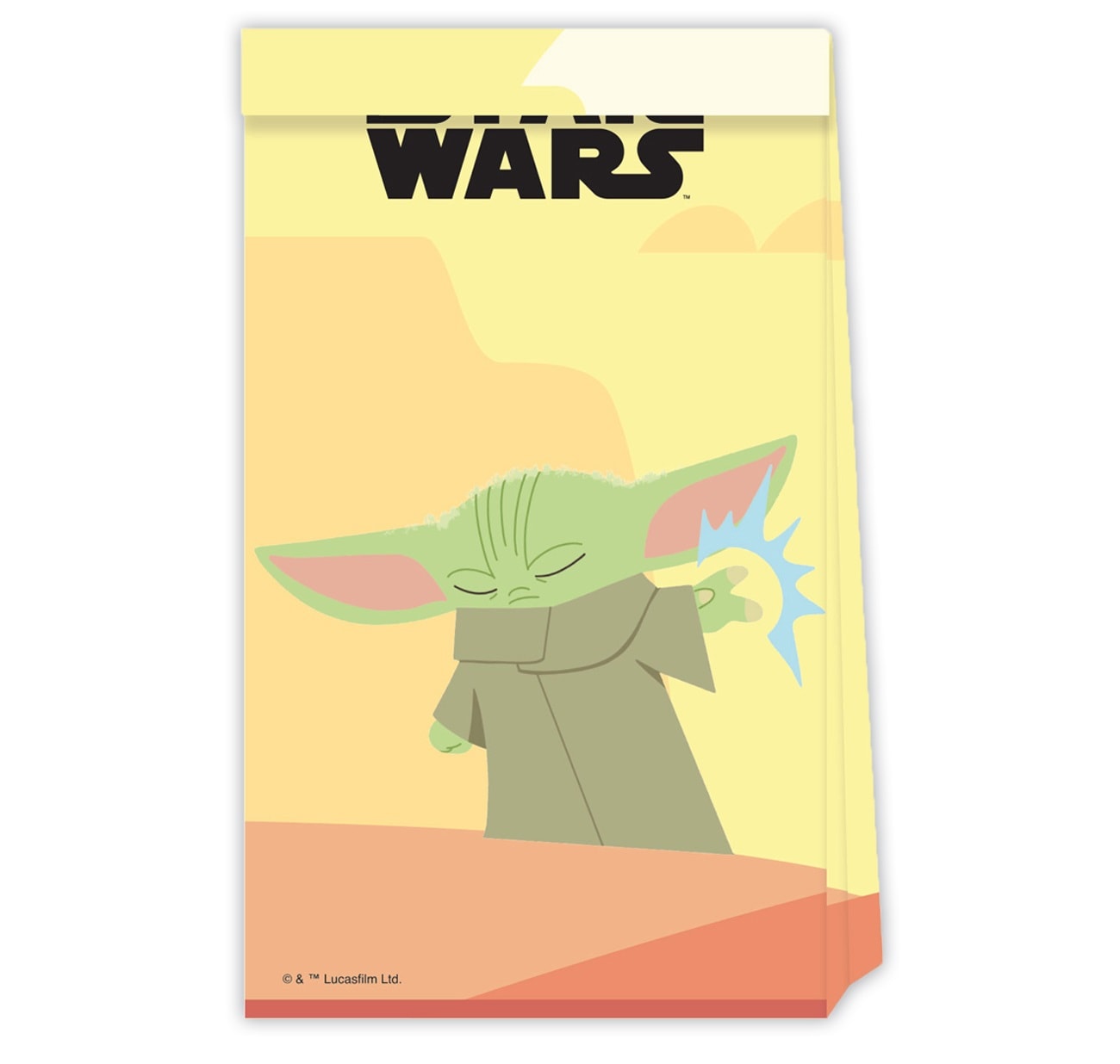 4 slikposer af papir med et sødt motiv af Grogu fra The Mandalorian på en sandfarvet ørkenbaggrund. Ideelle til at fylde med slik, små legetøj eller overraskelser, som børnene kan tage med hjem efter fødselsdagen.