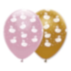 6 stk. latexballoner i farverne lyserød og guld og med motiver af smukke svaner. Dejligt at dekorere før festen med stilfuld svane som tema. Ballonerne er oppustet ca. 30 cm i diameter og kan oppustes med både almindelig luft og helium.