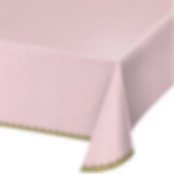 Stor plastikdug i en lyserød farve med guldfarvede kanter og stjerner. En rigtig god ide at have på bordet under festen med stilfuldt svanetema. Dugen er ca. 137 x 259 cm i størrelse.