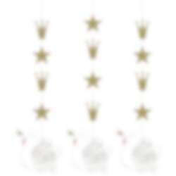 3 stk. hængende dekorationer med motiver af hvide svaner og stjerner og kroner i guld. En passende dekoration til at hænge op til festen med svane-tema. Dekorationer er ca. 91 cm lange, mens motiverne er omkring 18 cm store.