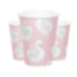 8 stk. papkopper i pink med motiver af hvide svaner og guldstjerner. En passende dekoration til borddækningen til svanefesten. Krusene er ca. 10 cm høje og har ca. 266 ml.